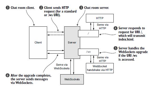 在我们的应用中,当 URL 请求以“/ws”结束时,我们才升级协议为WebSocket。否则,服务器将使用基本的 HTTP/S。一旦升级连接将使用的WebSocket 传输所有数据。