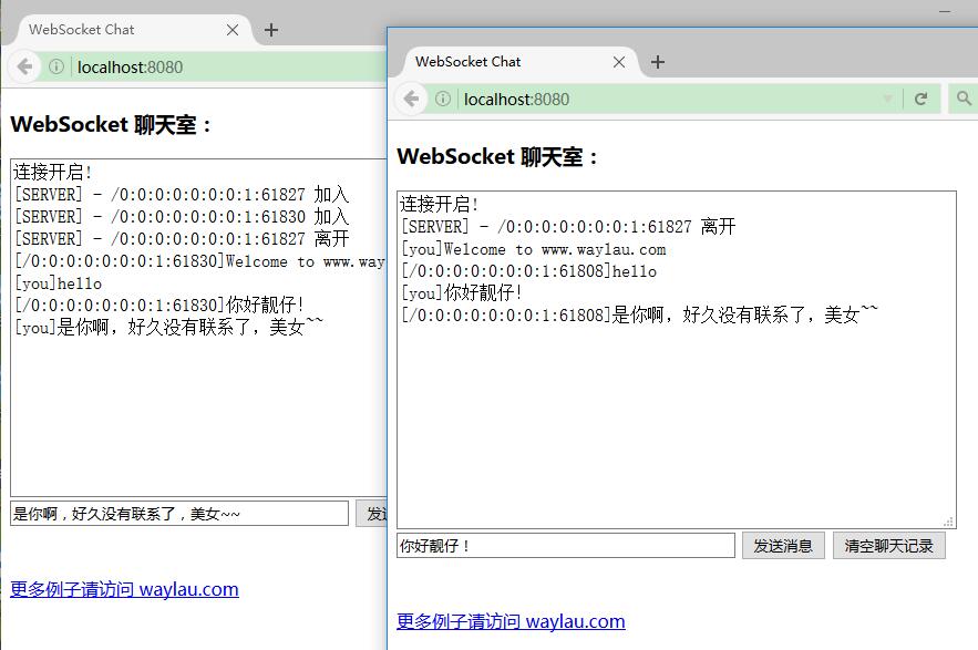 先运行 WebsocketChatServer,再打开多个浏览器页面实现多个 客户端访问 http://localhost:8080