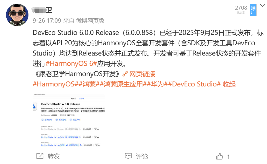 其实,早在2025年9月25日,DevEco Studio 6.0.0 Release(6.0.0.858)就已经正式发布,标志着以API 20为核心的HarmonyOS全套开发套件(含SDK及开发工具DevEco Studio)均达到Release状态并正式发布。开发者可基于Release状态的开发套件进行HarmonyOS 6应用开发。